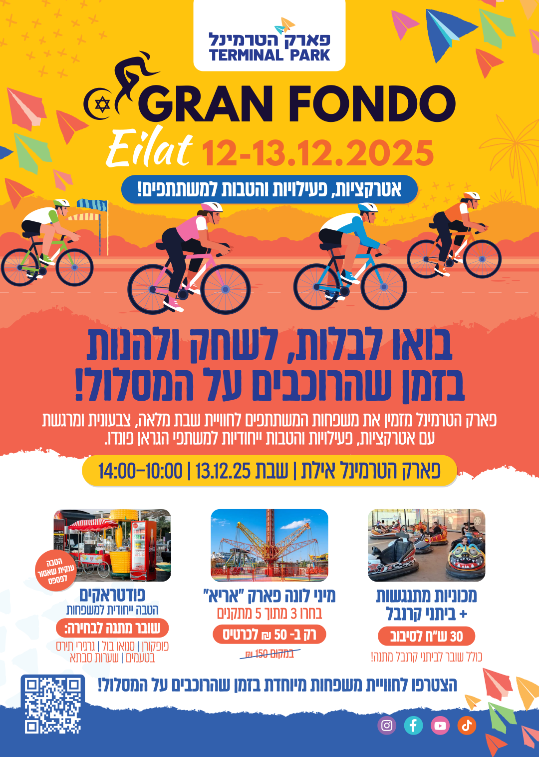 אחרי שלוש שנות הפסקה, תחרות גראן פונדו – מהאירועים האייקוניים ביותר של רכיבת הכביש בישראל – חוזר ובגדול. הפעם, גראן פונדו אילת 2025 מביא איתו חוויית רכיבה ספורטיבית וחגיגית, בלוקיישן האולטימטיבי: העיר אילת.